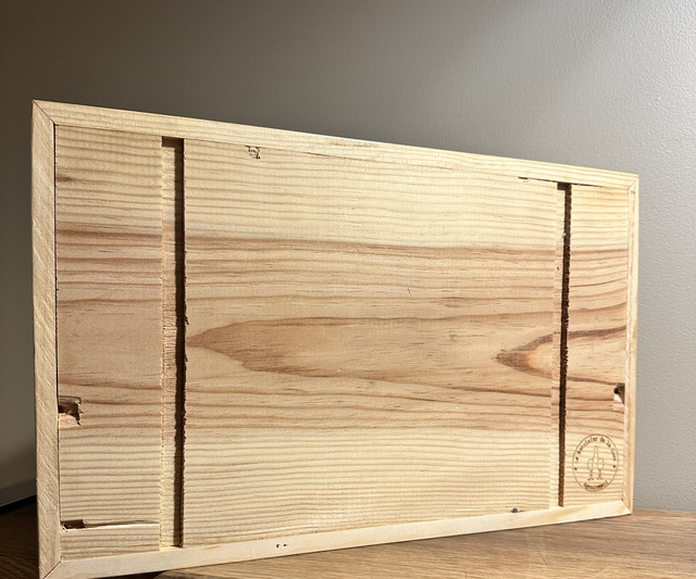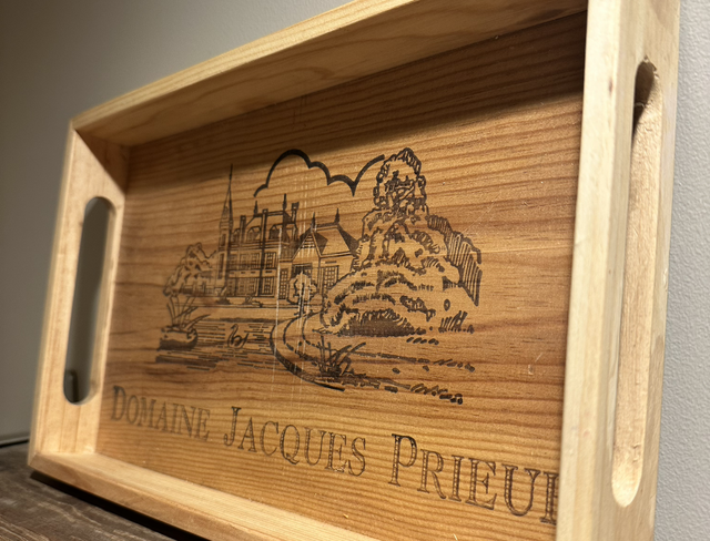Plateau de dégustation réalisé à partir d’une caisse vin. Visuel du domaine viticole Jacques Prieur.