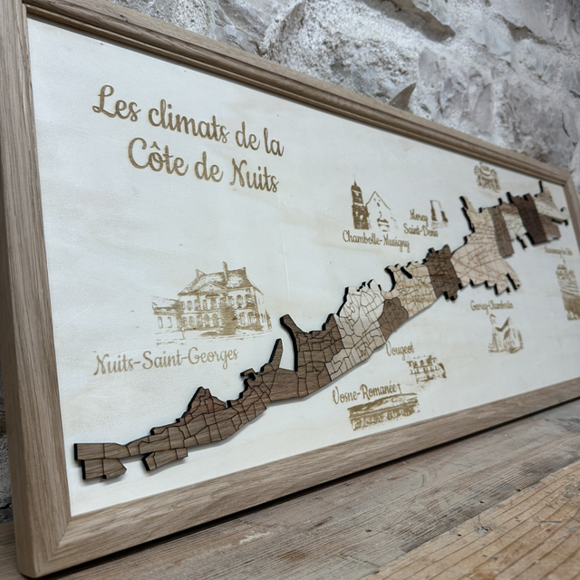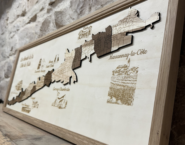 climats et illustrations des villages gravés sur fond en contreplaqué de peuplier, montants en chêne