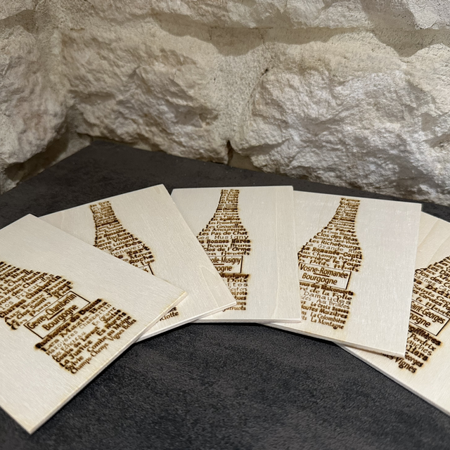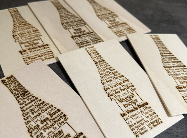 Carte postale de 3mm, 18 grammes gravée avec les climats les plus emblématiques des villages de la Côte de Nuits et de Beaune.